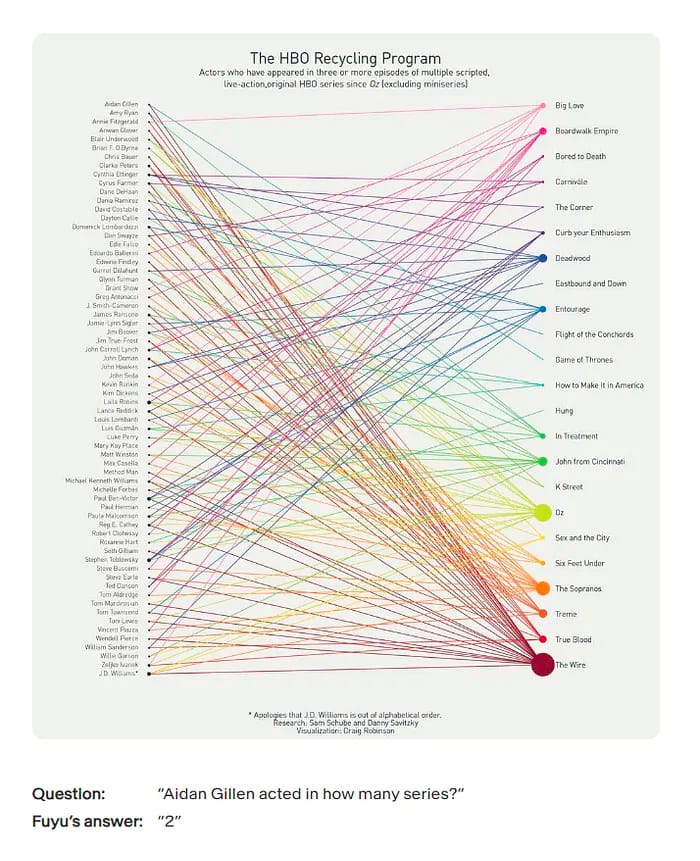 When faced with complex visual data, such as the chart depicted below, Fuyu excels at discerning intricate relationships, tracing connections between various elements, and counting to provide insightful answers: